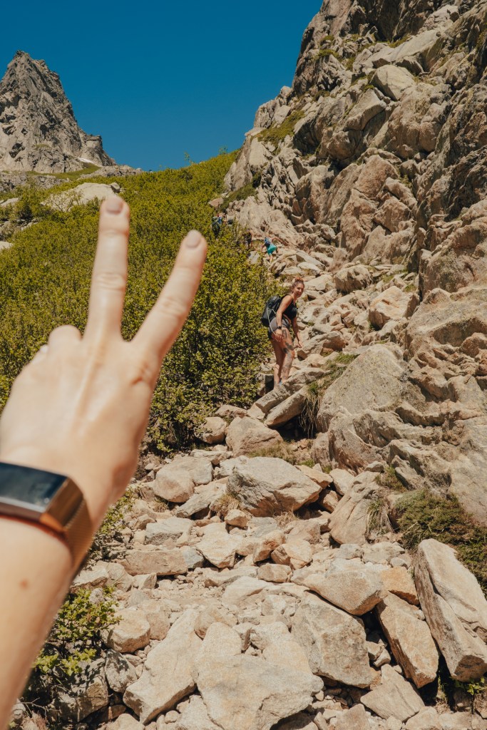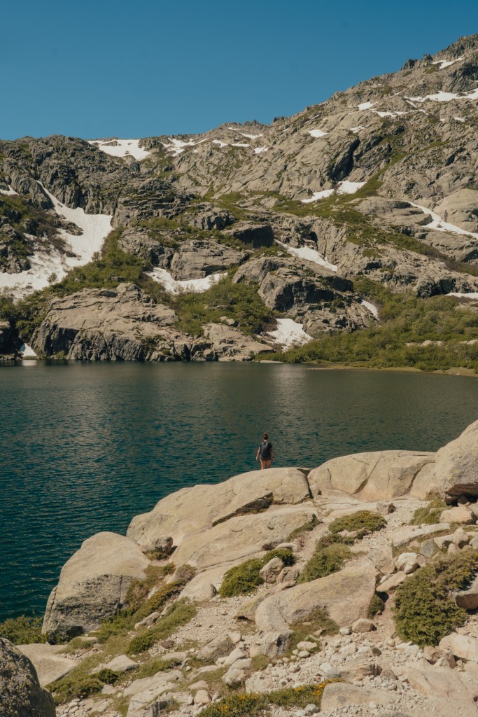 Si vous le souhaitez et êtes bien équipés, vous pouvez continuer votre randonnée jusqu`à la Brèche de Capitello, qui se trouve sur le GR20. Vous y aurez une belle vue sur les deux lacs. Pour y aller, passez à gauche devant le lac de Capitello et suivez la direction du GR20 et du refuge de Manganu (écrit en jaune sur un rocher). Voyant que la neige recouvrait encore une partie du chemin nous n’avons même pas essayé d’y aller.