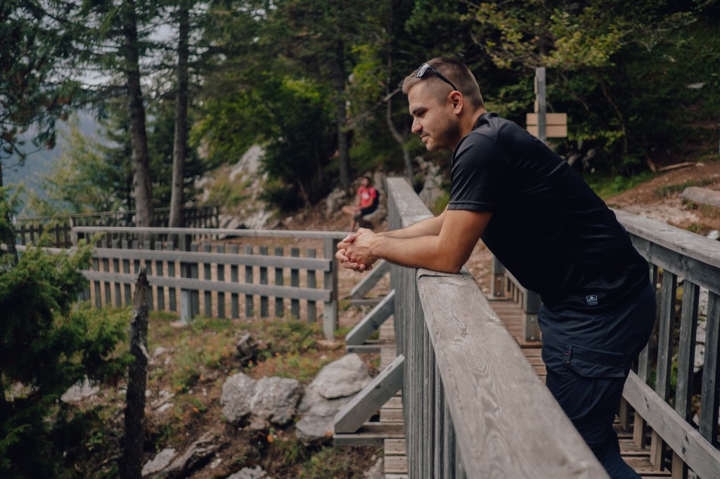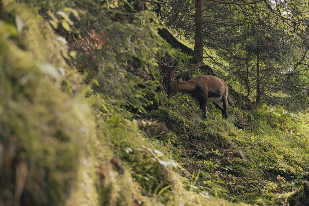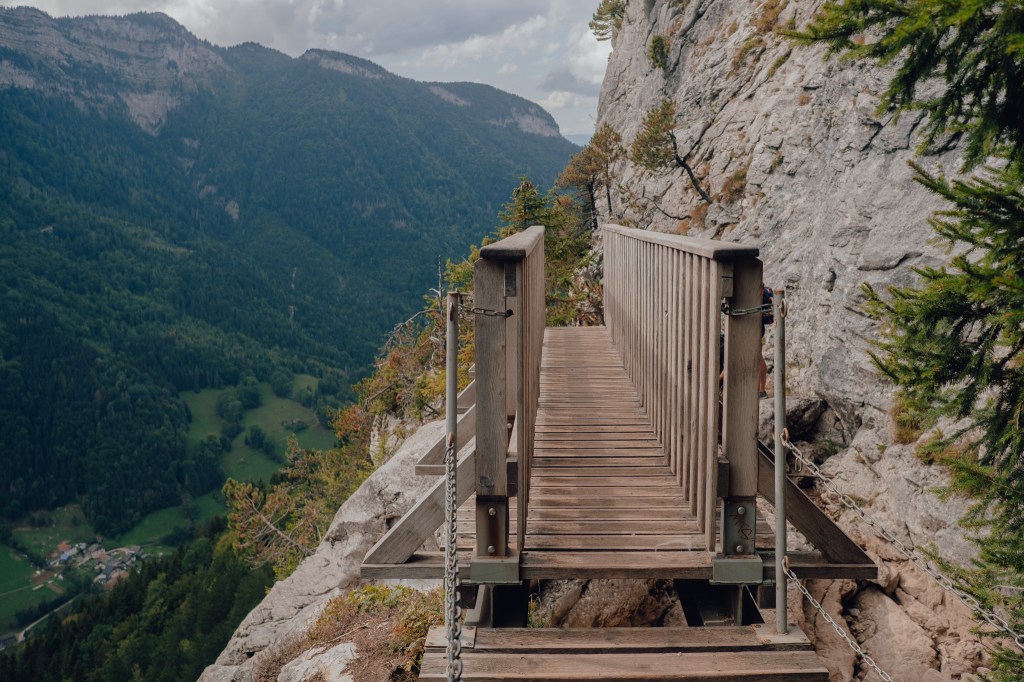 Après cette partie rocailleuse, on arrive sur une premiere passerelle vertigineuse au-dessus de la cascade du Pas du Roc. Quelques dizaines de mètres plus loin, on arrive sur une seconde passerelle qui nous conduit au Belvédère du Pas du Roc. Ce dernier offre une belle vue sur la vallée de Paccot qui s’étend à nos pied, avec en particulier la Grotte de la Diau juste en face de nous. Aussi, un panneau informe de l’historicité du lieu, où partisans français et Républicains espagnols étaient venus s’installer pour la Résistance dans les Glières contre l’armée allemande, constituant la « Compagnie Forestier ». Ce jour-là, ce sont plutôt de jeunes bouquetins qui occupait le lieu.
