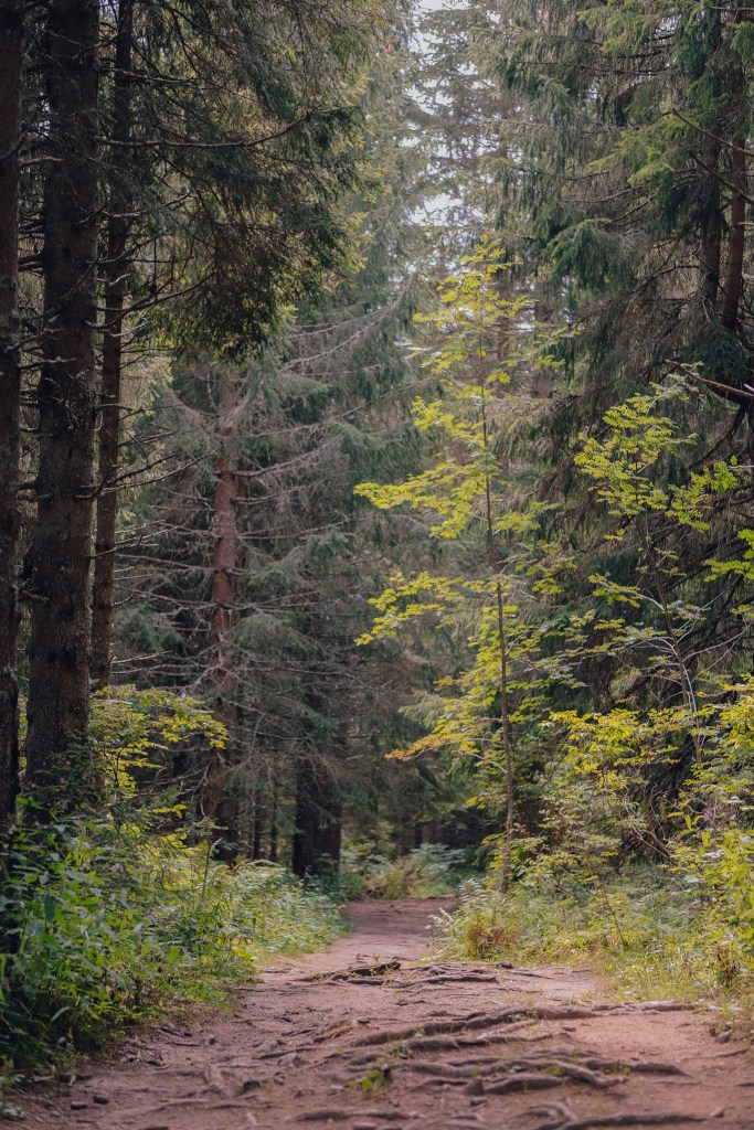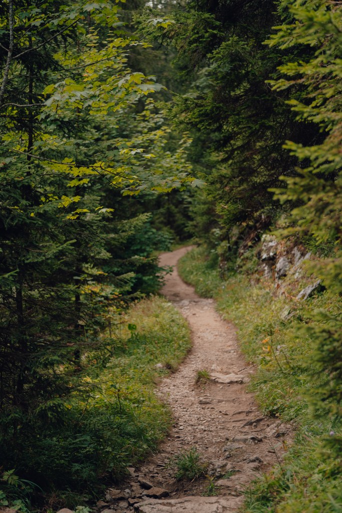 Il faudra justement redescendre cette route sur environ 200 mètres, et, sur votre droite, vous verrez un petit panneau indiquant le chemin qui monte au Pas du Roc. Celui ci vous fera passer dans une forêt de feuillus, puis une forêt de conifères, avant d’arriver à la partie plus aérienne du sentier.
