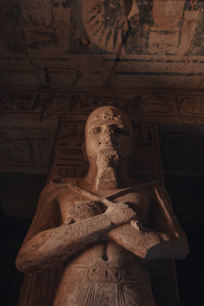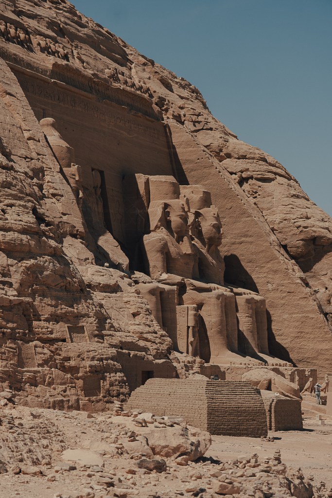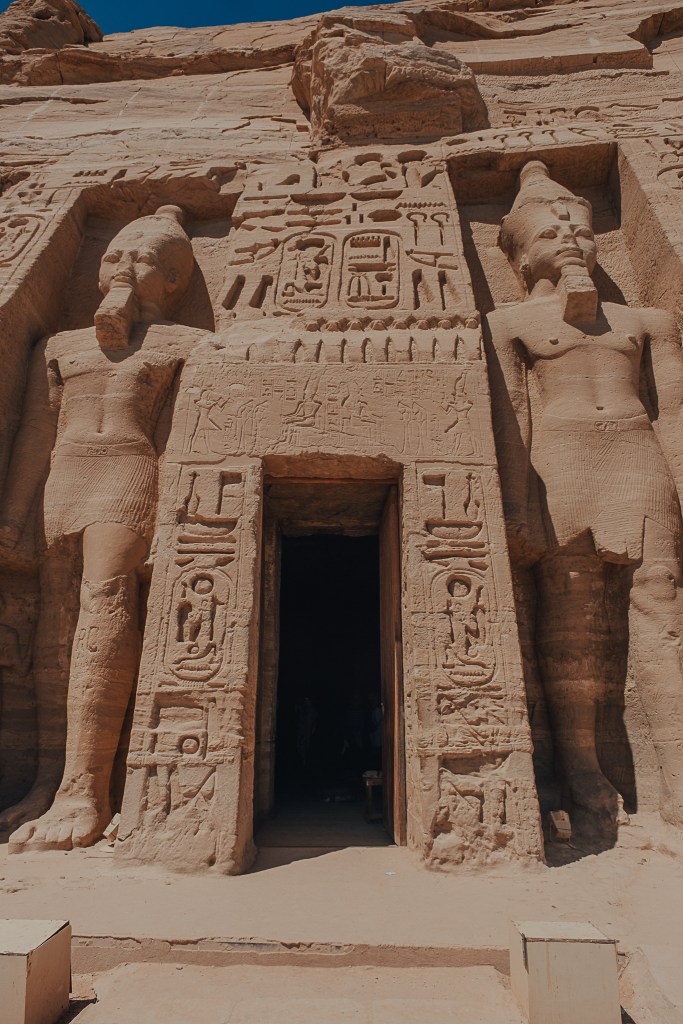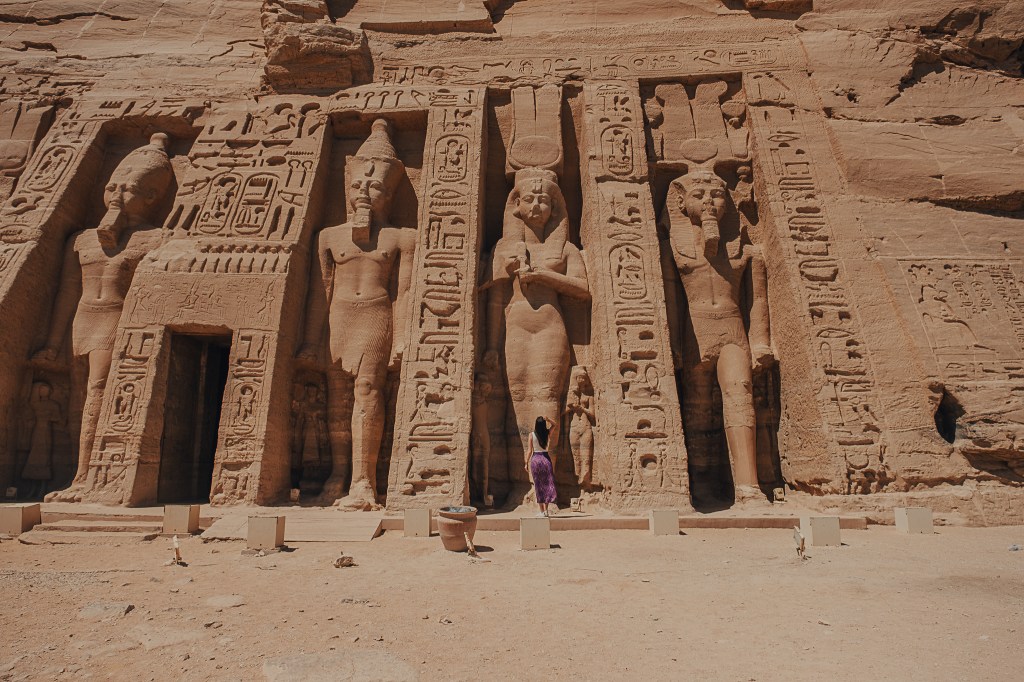 Le temple, dédié à Ramsès II lui-même, est impressionnant. Notamment grâce aux quatre colosses monumentaux, chacun mesurant environ 20 mètres de haut et représentant Ramsès II à l’entrée. Ce monument a été érigé pour commémorer sa victoire lors de la bataille de Qadesh. Il est aussi là pour affirmer son pouvoir divin sur la région nubienne, qui se situait alors à la frontière sud de l’Égypte antique.