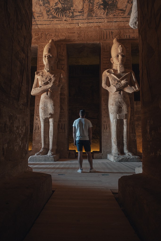 Après une quinzaine de minutes avec le guide, nous sommes partis à la découverte de l’intérieur des temples. Le temple principal est composé de 3 salles. La première vous accueille avec huit statues de 10 mètres de haut représentant le pharaon. Toutes aussi belles que celles de dehors et encore mieux préservées. Les murs sont ornés de bas-reliefs relatant les grandes victoires militaires du roi, comme la fameuse bataille de Qadesh. La seconde salle elle est remplie de bas-reliefs religieux. La dernière salle est le sanctuaire dans laquelle on retrouve les fameuses 4 statues.